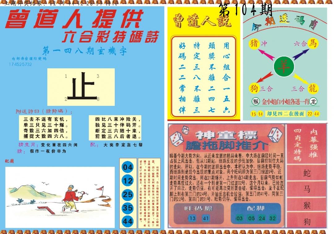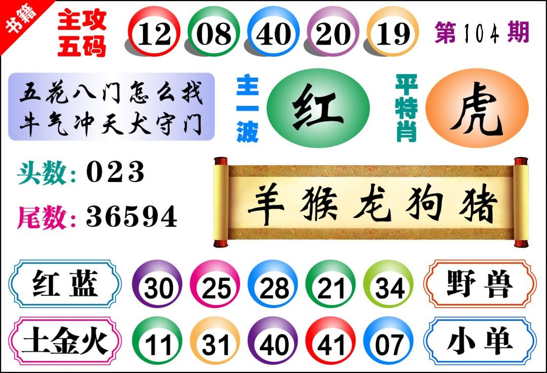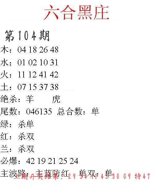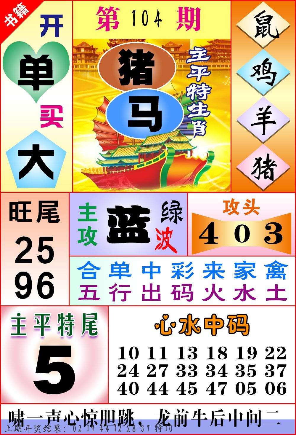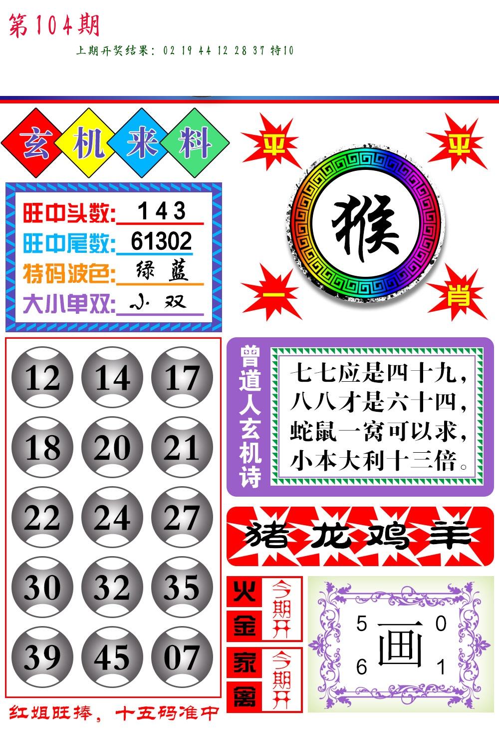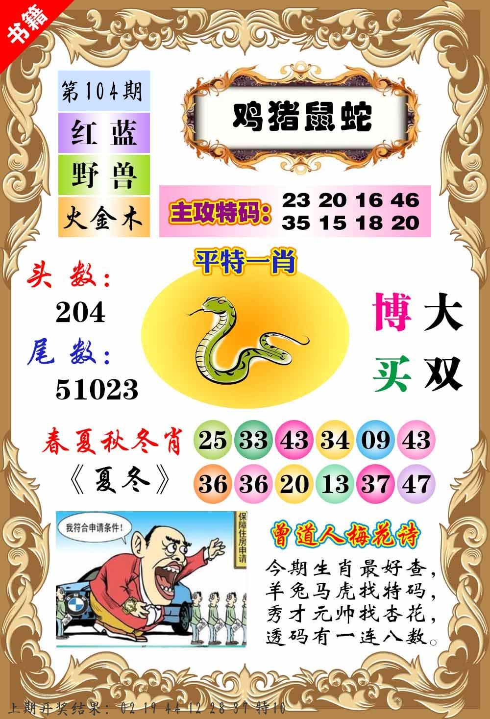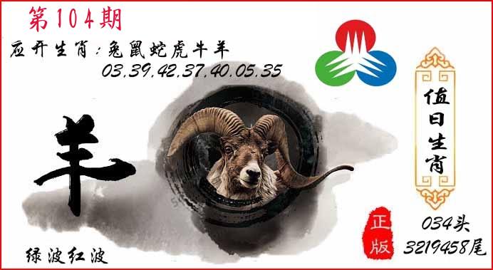 | 104期 四肖: 蛇马羊猴 | ⑤码: 14.36.38.11.48 |