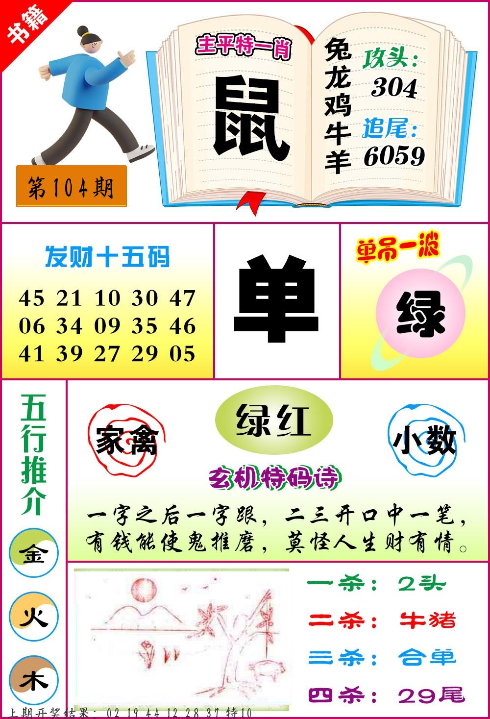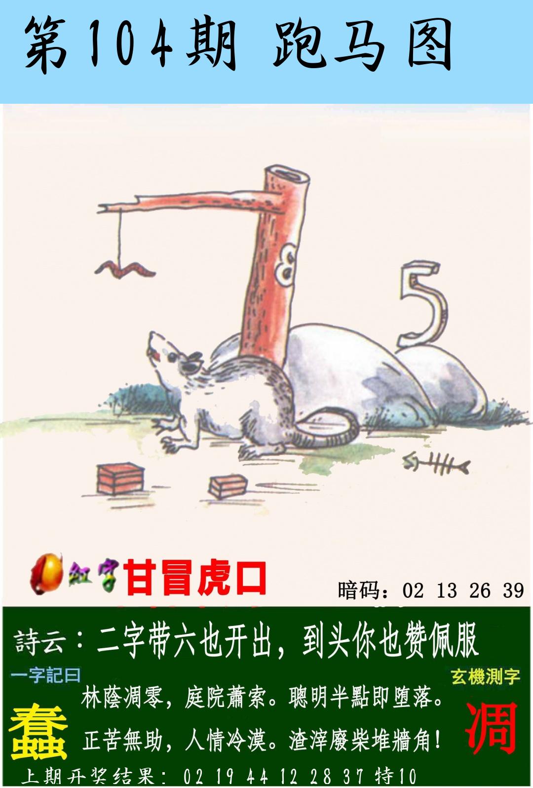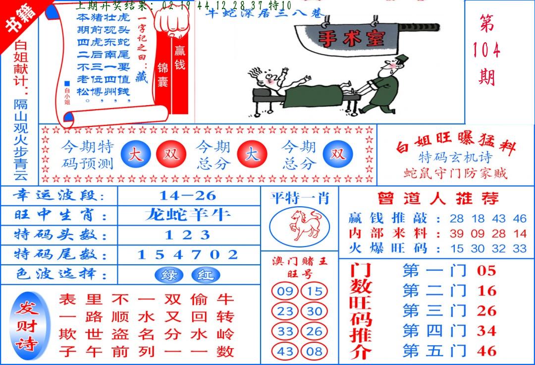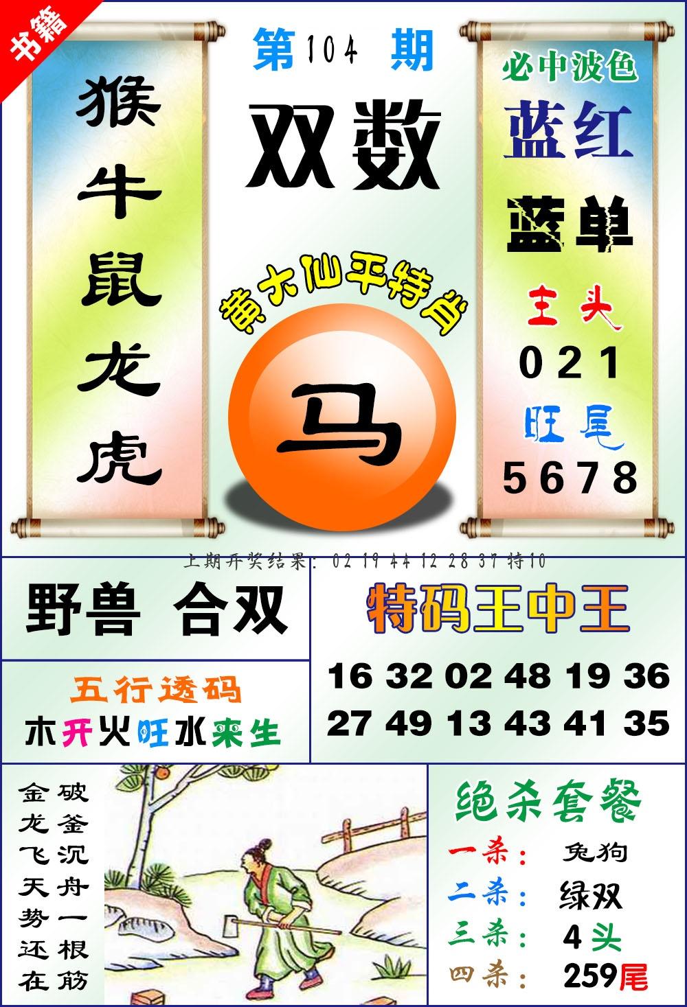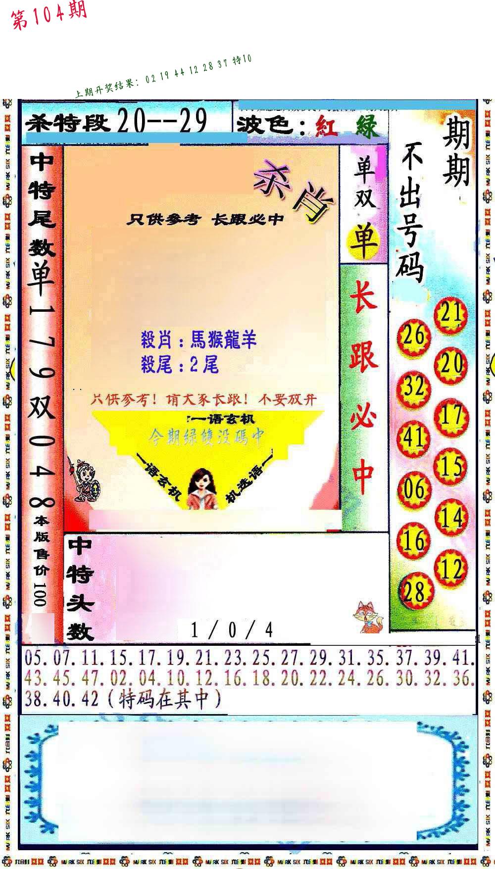 | 104期 四肖: 蛇马羊猴 | ⑤码: 14.36.38.11.48 |