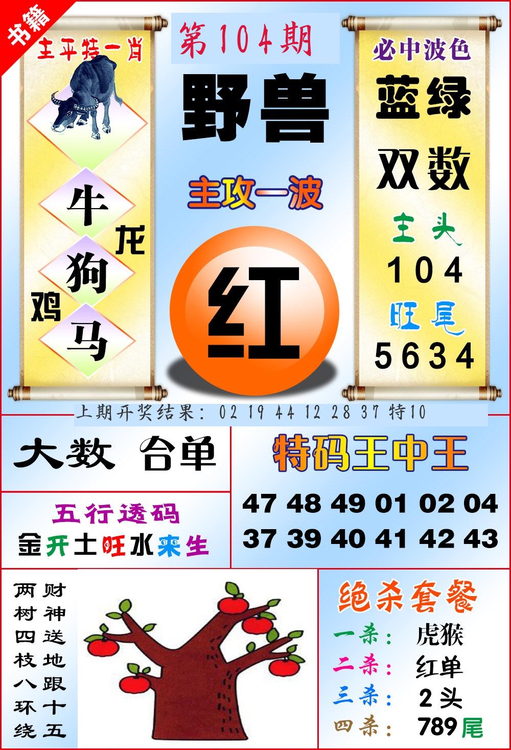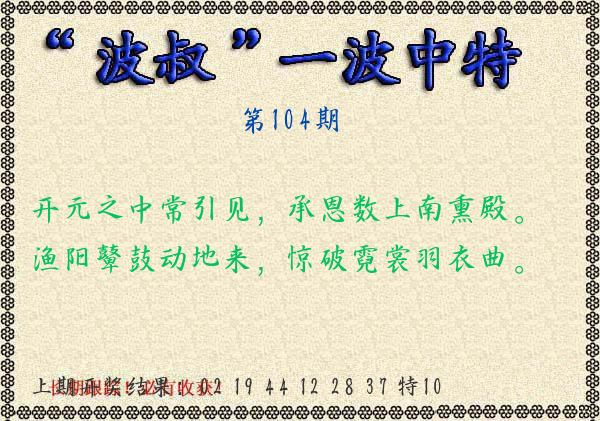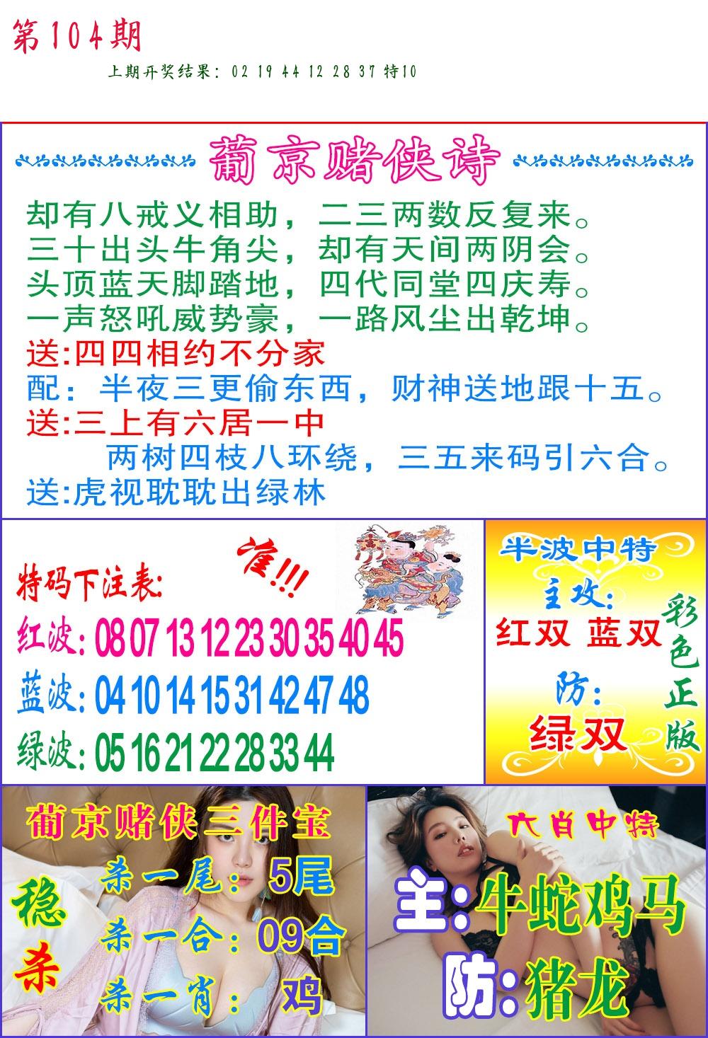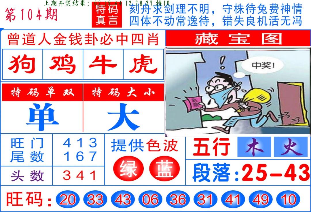 | 104期:绝密▲双波【蓝波+绿波】开:????? |