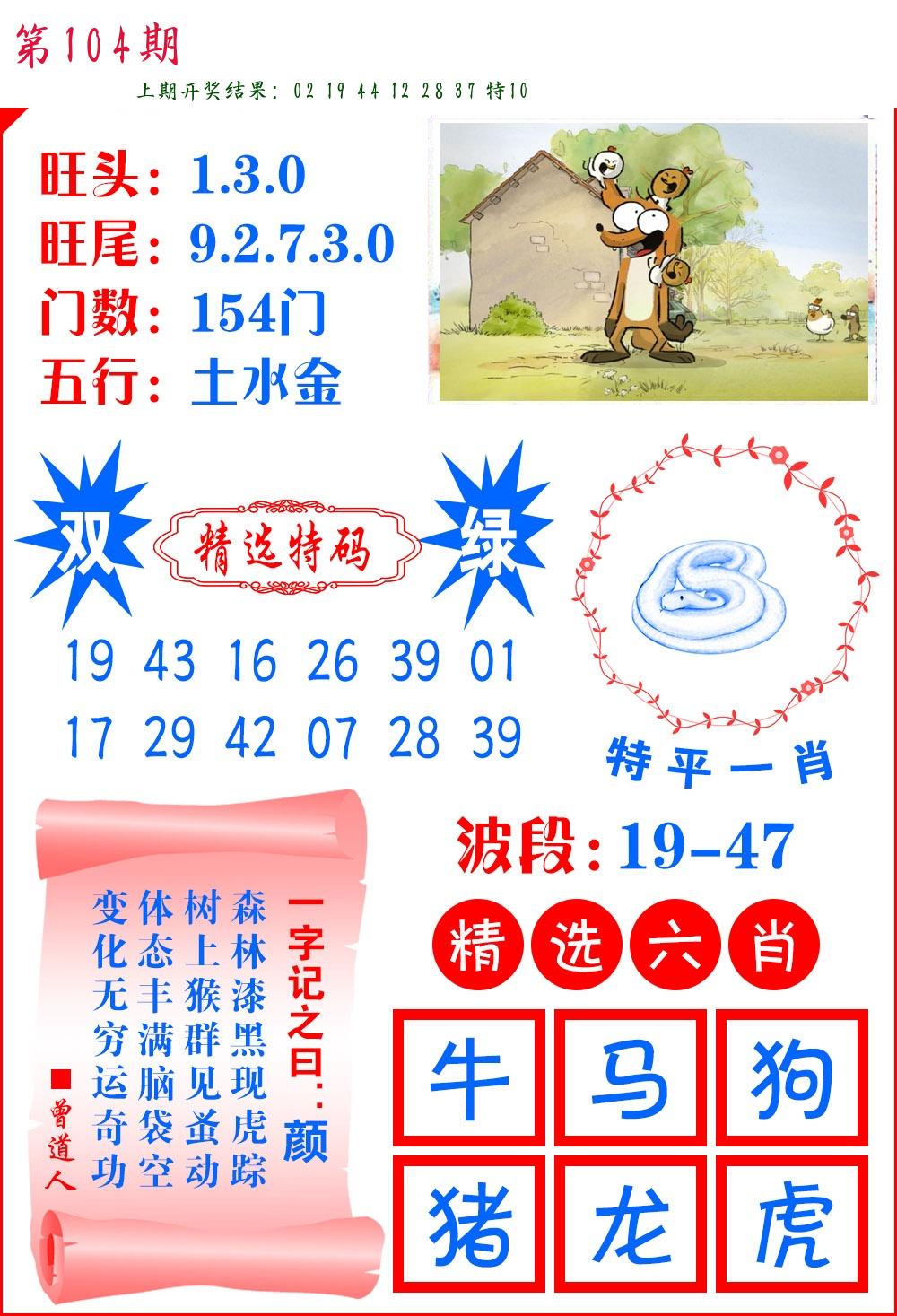 | 102期 四肖: 猪鼠马牛 | ⑤码: 08.43.19.39.42 |